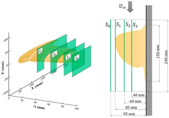 - Test section distance to the wall: 40 (S3), 60 (S2), 85 (S1), and 95 mm (S0). Each test section corresponds to planes parallel to the wall placed in the symmetric plane of the morphing model (See Figure 6)