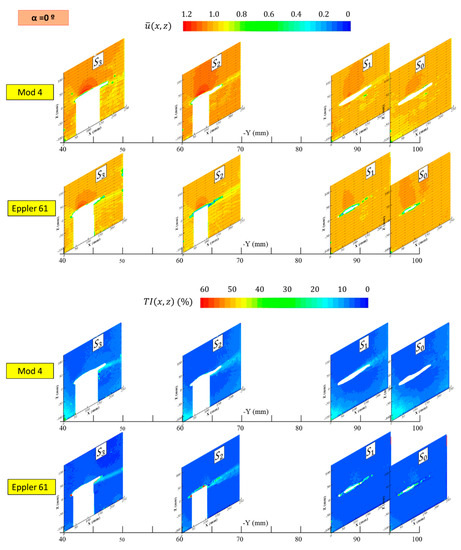 Non-dimensional velocity maps and turbulence intensity maps for each section at an angle of attack of 0°.