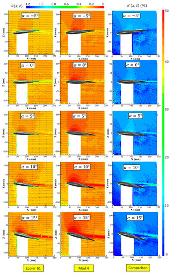 Comparison of the velocity maps in Section S2, for angles of attack −5°, 0°, 5°, 10°, and 15°.