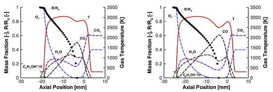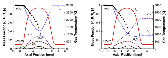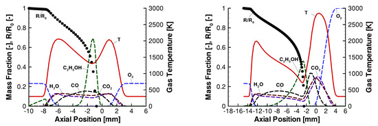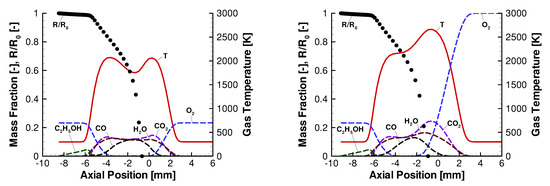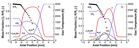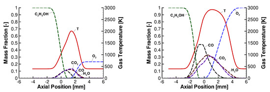 Figure 1 (left) displays an ethanol/air gas flame at low strain rate, where ethanol at atmospheric pressure is directed against an air stream of the same temperature. The initial gas temperature of 400 K is well above the boiling temperature of ethanol at atmospheric pressure. Then the progressive replacement of N by O2 is carried out to obtain an ethanol/O flame, cf. Figure 1 (right). Please note that the axial position 0 mm identifies the gas stagnation plane. The maximum gas temperature of the ethanol/air flame is 2010 K, and the flame resides on the oxidizer side of the configuration, which is typical for these flames [15,17]. The peak value of the CO mass fraction near 0.8 mm is closer to the fuel side of the configuration than the maximum flame temperature, since CO is produced prior to CO and the carbon-containing fuel enters from the left side of the configuration. CO2 attains a peak at about 1.6 mm since CO2 is mainly produced through the reaction