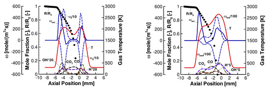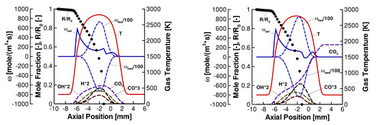 In view of the addition of CO2 to the system, the reaction rate of the chemical reaction CO + OH ⇌ CO + H is analyzed and shown in Figure 2. The net molar chemical reaction rate for CO and the corresponding production and consumption rates, the gas temperature, and the mole fractions of the chemical species involved in the above chemical reaction are plotted against the axial position for the ethanol/air (left) and the ethanol/O (right) gas flames. In the pure oxygen flame, more CO is produced on the fuel side of the flame, which may reverse the direction of the above chemical reaction, leading to decomposition of CO. Once the temperature reaches a value of 2500 K, the direction of the chemical reaction reverses again since it is endothermic, and CO is produced in the hot part of the flame. Towards the gas side of the configuration, the chemical reaction rate decreases until a temperature of 1500 K is reached, at the edge of the chemical reaction zone at an axial position of about 4 mm. The concentrations of the H and OH radicals are about 10 times higher in the ethanol/O flame compared to the ethanol/air flame.