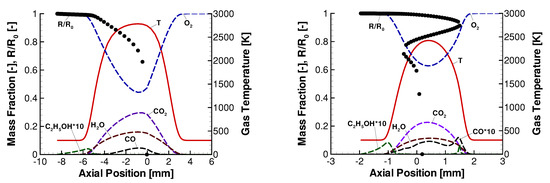Structures of ethanol/air (left) and ethanol/O (right) gas flames at inlet temperatures of 400 K and a gas strain rate of 55/s on the fuel side of the configuration.