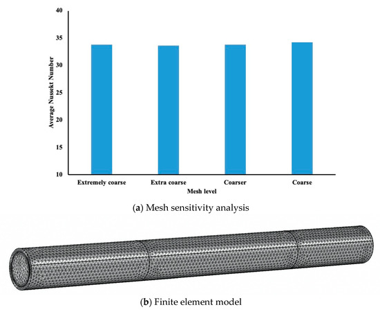 Before running different study cases on COMSOL, the mesh sensitivity was examined whether it was accurate enough to record the numerical results from the model. In the Table 2, we demonstrated different mesh sensitivity that we can select using COMSOL software. The mesh levels that COMSOL supports and the elements numbers for each mesh level are shown above. The average Nusselt number was evaluated at the inner wall of the pipe for each mesh level, and the results are represented in the Figure 2a. It is evident that a coarse level will be suitable to be used in the COMSOL model. Figure 2b, presents the finite element mesh used in our simulation. In addition, the model has been tested by comparing the numerical data with some experimental results [8]. The model consisted of the same boundary condition to the current one.