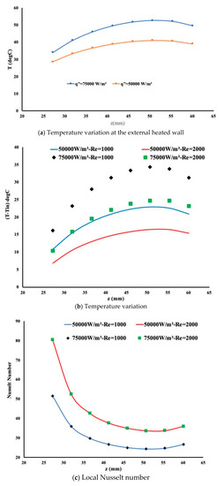 The temperature has been measured at the wall of the internal pipe along the heated section only. Figure 4, Figure 5 and Figure 6 highlight the temperature variation for the three configurations. Figure 4a presents the temperature variation at the external heated wall. A high temperature is observed and the temperature profile is expected. In Figure 4b the temperature variation is non-linear mainly near the end of the heated section. As the Reynolds number increases, the flow rate leads to more cooling of the internal wall. The temperature profile is identical for the cases, however, the Nusselt number is evaluated as well to examine the heat enhancement. By definition, the local Nusselt number is calculated as follows: