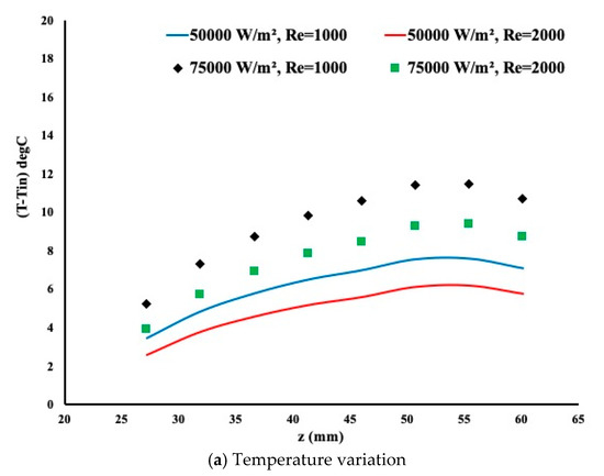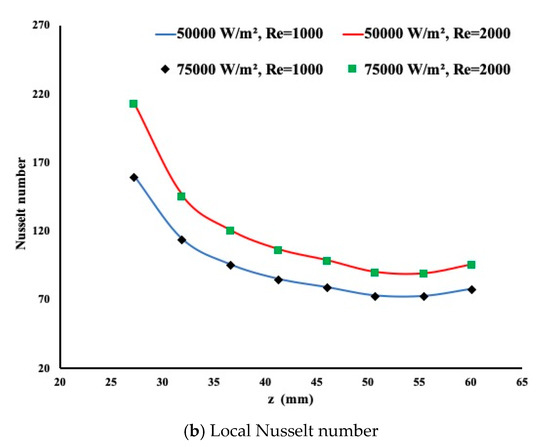 Similarly, the heating and the flow rate are applied when a porous insert is implemented in the model. By examining Figure 5a, a slower flow rate leads to more heat extraction as observed in the previous case. In addition, the presence of a porous medium forces the flow to exert more contact with the pore and thus more heat is extracted. The temperature variation is almost linear contrary to the previous case where the linearity is removed towards the end of the heated section. Figure 5b presents the local Nusselt number variation. It is evident from this graph that heat extraction is more pronounced in the presence of a porous insert as the local Nusselt number is larger in magnitude.