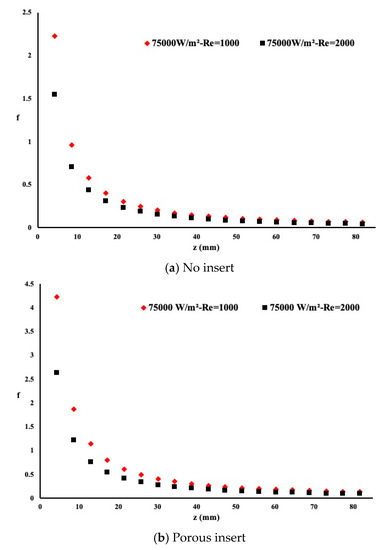 where is the pressure change between the pipe inlet and outlet in kPa, D is the diameter of the pipe, L is the length of the pipe and is the fluid density and w is the fluid velocity on the z direction. Figure 8 presents the friction coefficient along the entire length of the pipe for a heat flux of q″ = 75,000 W/m2 and for two different Reynolds numbers. It is evident that the flow in the plain pipe exhibited the lowest friction coefficient when compared to the porous insert case or the twisted tape case. However, as observed earlier in the presence of a twisted tape case or porous case, the heat extraction showed better performance at the expense of a higher friction coefficient. As the Reynolds number increases, the friction coefficient increases correspondingly. The variation pattern along the flow direction is the same for the case of plain pipe and twisted insert. However, fluctuation in the pattern exists for the porous insert due to the non-uniform flow circulation between the pores.