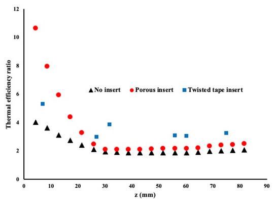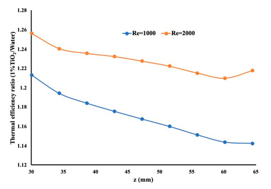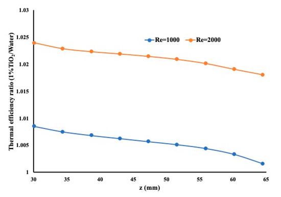 In the current comparison, Figure 9 presents the thermal efficiency ratio of the case of Reynolds number equal to 2000 over the case where the Reynolds number is equal to 1000. This coefficient is calculated along the entire pipe. The heat flux is set equal to 75,000 W/m2 and the inlet temperature is maintained at 18 °C.