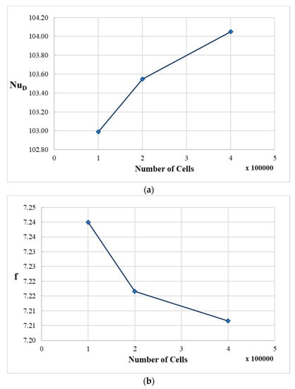 Grid independence was tested using three grid sizes (100,000, 200,000, and 400,000) for wavy-walled tube having Fw = 0.58 and ReD = 1000. Figure 3a shows the Nusselt number for these grids. It can be noticed that the maximum deviation in the Nusselt number remains up to 1.02%. Also, Figure 3b shows the friction factor for these grids. It can be noticed that the maximum deviation in the friction factor remains up to 0.463%. It can be noticed that in each case the deviation remains less than 2%.