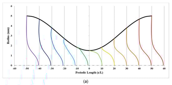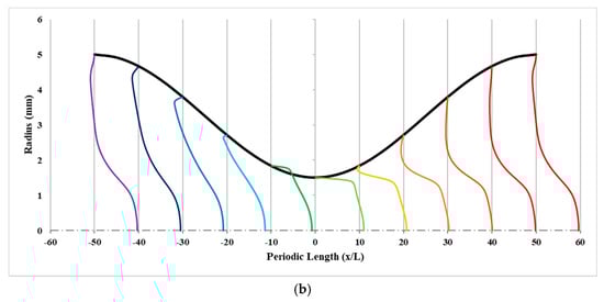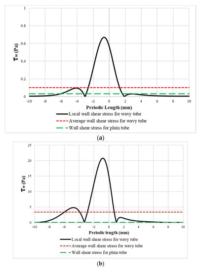 Iso-surfaces were created in Ansys Fluent software at positions that divide a single period of a wavy-walled tube into 10 segments, hence, eleven iso-surfaces were created on which values of axial velocity were extracted and is shown in Figure 4. Figure 4a shows the velocity profiles for laminar flow hence having a smooth change in velocity gradients, while Figure 4b shows velocity profiles for turbulent flows, and hence a sharp change in velocity profiles can be observed near the wall. It can be observed from Figure 4 that there are negative values present in the axial velocity profile that indicates flow reversal. This is because wavy-walled tubes have convergent and divergent sections. Flow separation occurs in the divergent section of the tube that can also be observed from wall shear stress (τw) distribution shown in Figure 5.