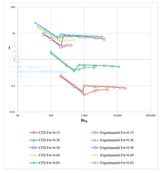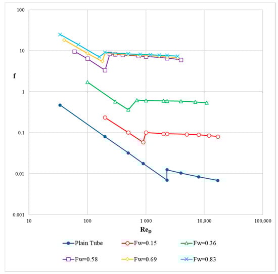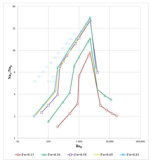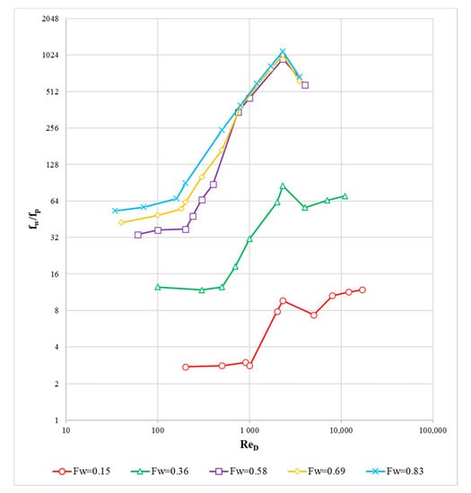 A relationship between the friction factor for wavy-walled tube and plain tube can be formed as shown in Figure 9. It can be seen that as the Reynolds number increases, the friction factor becomes much higher in wavy-walled tubes compared to that of plain tubes. It is because flow becomes turbulent in wavy-walled tubes at a lower Reynolds number than that of plain tubes, hence causing higher friction factor, reaching a maximum value of fw/fp = 1096 for Fw = 0.83, where fw is friction factor for wavy-walled tube and fp is friction factor for the plain tube. But, as the flow becomes turbulent in plain tubes after ReD = 2300, the friction factor rises in it, and hence the ratio fw/fp decreases at that instant. After increasing the Reynolds number further, the decrement in the friction factor of the wavy-walled tube is observed to be much lower than that of a plain tube, therefore, fw/fp again tends to increase.