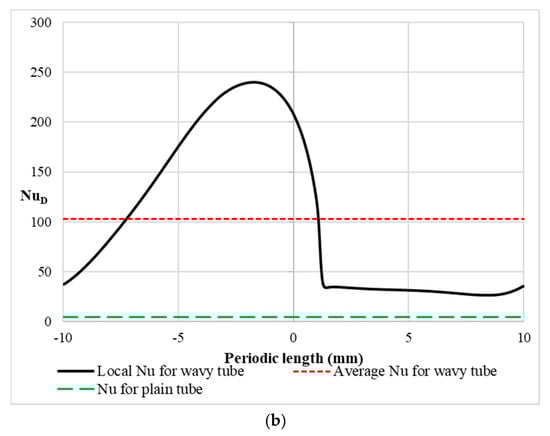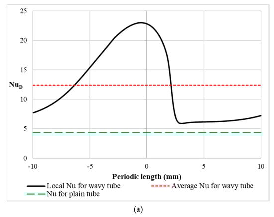 For the thermal analysis of these tubes, a dimensionless heat transfer parameter, that is, the Nusselt number, was computed for all the tube geometries. Local Nusselt number distribution along the tube length is shown in Figure 10. It can be seen from Figure 5 and Figure 6 that due to the convergent and divergent sections in the wavy-walled tube, flow separation occurs in the divergent section and then re-attachment occurs in the convergent section, this phenomenon varies the rate of heat transfer along the tube axis. Figure 10 shows that the Nusselt number is highest in the region of lower diameters due to the presence of high velocities in this narrow section that enhances the rate of heat transfer. It is because flow with high velocity can carry the heat much faster compared to low velocity, and hence, the Nusselt number increases. Similarly, when the flow starts to detach from the tube wall in the divergent section, the circulation of the fluid takes place due to which fluid accumulates in the bulgy part of the tube. Since the fluid velocity in the circulation zone is much lower than the bulk fluid velocity in the region around the central axis of the tube, heat transfer is resisted in that bulgy region. This is why the Nusselt number plot shown in Figure 10 has a peak in the center, which is the narrow region and then suddenly drops when the flow starts to separate in the bulgy region of the wavy-walled tube. It is worth noting that the local Nusselt number for wavy-walled tubes is always higher than the plain tube, even in the region where it is lowest. This shows a primary benefit of using these tubes over the plain tubes. The local Nusselt number in this work is calculated using Equation (12).