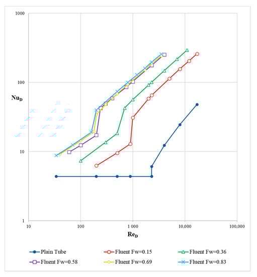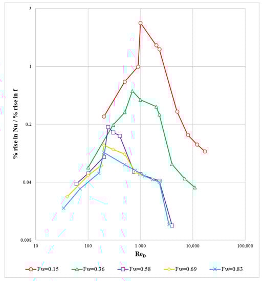 From the hydrodynamic and thermal analysis of wavy-walled tubes, it has been observed in this paper that these tubes provide a significant amount of rise in heat transfer, but at the expense of extra pumping power. For optimization purposes, such a tube would be a better option that will provide a higher rise in Nusselt number from plain to wavy-walled tube compared to the rise in friction factor. For that purpose, a graph was formed and is shown in Figure 14. Higher values in Figure 14 represent better thermal performance with lower expense in pumping power, while lower values show a higher demand for pumping power with a little rise in heat transfer rates. According to this graph, only a tube with Fw = 0.15 surpasses the value of 1, which shows that it will be having a higher rise in Nusselt number compared to that of friction factor. Therefore, its heat transfer rates will be increased higher than the increment in pumping power. But, the tubes of high waviness (say Fw = 0.83), which perform better for heat transfer, will also require much more pumping power. But if we only consider the thermal analysis of these tubes, of course, higher waviness in the tube surface would result in higher heat transfer rates as shown in Figure 11 and Figure 13. So, these tubes are a good replacement to the plain tubes where compactness of the heat transfer system is a primary focus. In such scenarios, usually pumping power is a secondary matter which could have been neglected if compared with the gain in heat transfer.