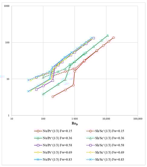 Since heat and mass transfer undergo the same physical phenomenon, Figure 12 was also found to show a similar trend that has been presented by Bian et al. [23] for the variation of Sh/Sc1/3 with respect to the Reynolds number. These trends can be compared by plotting a relationship between Nu/Pr1/3 to the Reynolds number shown in Figure 12, where the Nusselt number (Nu) is analogous to the Sherwood number (Sh), and the Prandtl number (Pr) is analogous to the Schmidt number (Sc).