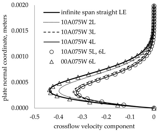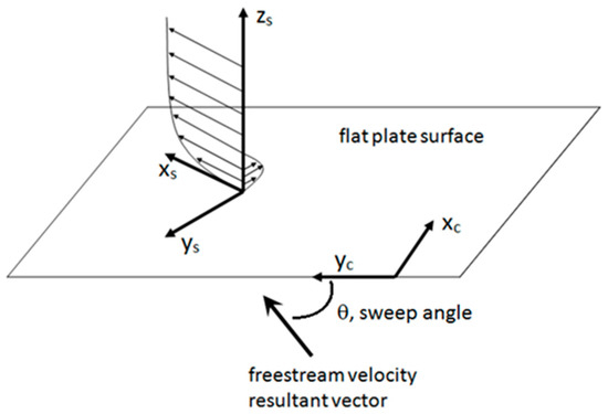 Three-dimensional boundary layer stability generally requires the analysis to include a crossflow velocity component perpendicular to the local freestream vector. For a flat plate or airfoil, sweep and the presence of a favorable pressure gradient in the chord direction produce a crossflow velocity component. Crossflow disturbances arise as stationary and traveling waves across the span of the surface and can result in earlier transition than chordwise instabilities. A theory for three-dimensional boundary layer stability has been developed by Gregory et al. [30] and Malik et al. [31] for the rotating disk, along with Mack [32] and Nitschke-Kowsky and Bippes [33], among others. Researchers have also used simplified base flow profiles such as the self-similar Falkner–Skan–Cooke [34,35,36] family of solutions over a swept yawed wedge to approximate a three-dimensional laminar boundary layer with a favorable pressure gradient over a swept flat plate [33] and swept wing [37].