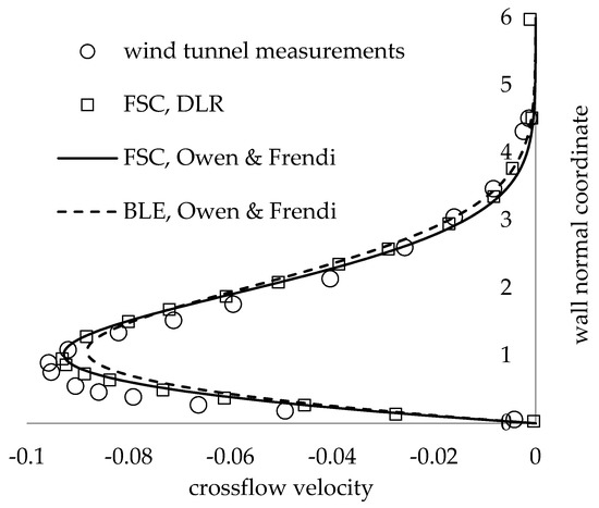 The FSC equations, infinite span BLE, and full 3-D BLE integrations were first solved for the case of a zero pressure gradient and a 45° swept plate, with all the results matching published values for the Blasius profile. Next, the FSC and infinite span BLE were compared to experimental data from the DLR [33] for a swept plate with a strong favorable pressure gradient, at an 80% chord location. An effective sweep angle of 42.5° was used in the calculations based on the DLR data. For the BLE code, the spanwise flow component of the freestream velocity was set to a constant 13 m/s, and the freestream velocity component in the chord direction increased linearly from 4.9 to 19.1 m/s to match the measured velocity gradient. Fischer and Dallmann [45] provide values for the FSC parameters from 10% to 90% chord, which were used to set up the FSC code. The infinite span BLE code requires an initial velocity profile to begin the marching procedure. The initial conditions at 10% chord were provided from the FSC integrator and marched forward in the BLE code to 80% chord. Figure 3 and Figure 4 show the comparison of the experimental and calculated velocity profiles aligned with the local freestream vector. Good agreement was found between the FSC calculations of Fischer and Dallmann [45] and our results, and between the BLE integrations and experimental data.