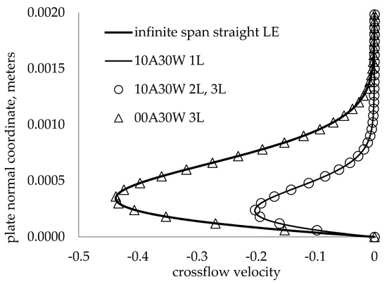 Next, the full 3-D BLE were compared for an infinite span flat plate with wavy and straight LEs under the DLR freestream conditions. To properly compare the infinite span straight LE and wavy LE boundary layers, the BLE for the wavy LE geometry were integrated spanwise across successive LE peaks until the flow profile at each LE peak did not change with further spanwise integration. The infinite span boundary layer profile was used as the initial condition at the wavy LE peak to start the integration. Figure 5 shows the crossflow boundary layer profiles for a wavy LE of 10% chord amplitude and 7.5% chord wavelength (10A075W) at different span locations. It is seen that the flow develops from the infinite span straight LE profile until it reaches a limiting profile at four wavelengths (10A075W 4L). Subsequent integrations to 5L and 6L show no change in the base flow profile. Furthermore, the same grid was used to integrate the infinite span solution spanwise across six wavelengths for a straight LE (labeled 00A075W 6L), and it is seen that the integration preserves the initial condition velocity profile, indicating no significant discretization errors. A similar result is found in Figure 6 for the wavy LE with a 10% chord amplitude and 30% chord wavelength (10A30W), except that the boundary layer reaches the limiting profile at one LE wavelength.