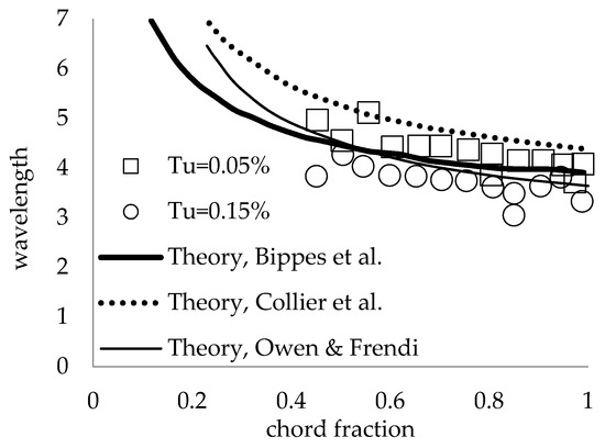 Plot of the most amplified stationary wavelength parallel to the plate LE as a function of the chord fraction. Measurements shown for two different wind tunnel turbulence intensities, Tu.