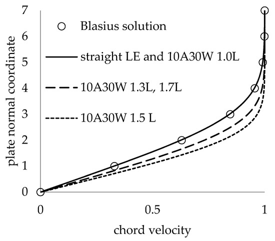 Finally, the effect of the LE amplitude was investigated by calculating boundary layer profiles at different chord locations for amplitudes of 5%, 10%, and 20% chord, with a fixed 30% wavelength and fixed span location at the wavy LE trough. As shown in Figure 11, increasing the amplitude at the trough has a similar effect on the boundary layer thickness as the results in Figure 9 show; increasing the amplitude decreases the boundary layer thickness towards the LE, and the thicknesses tend towards the Blasius solution as the chord location increases.