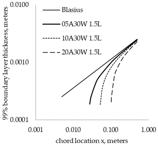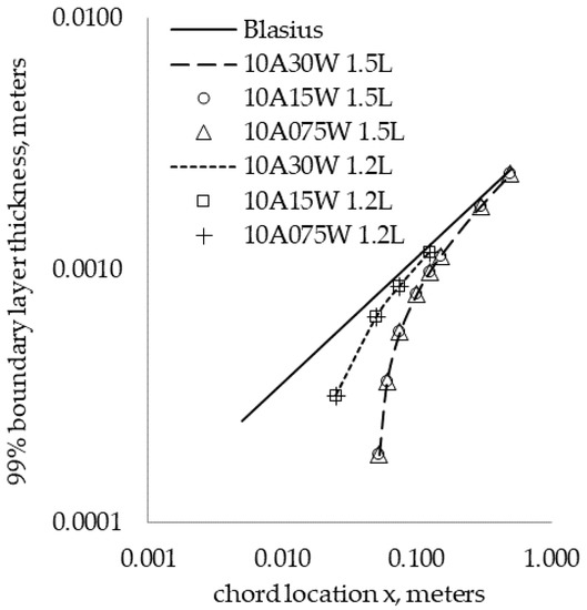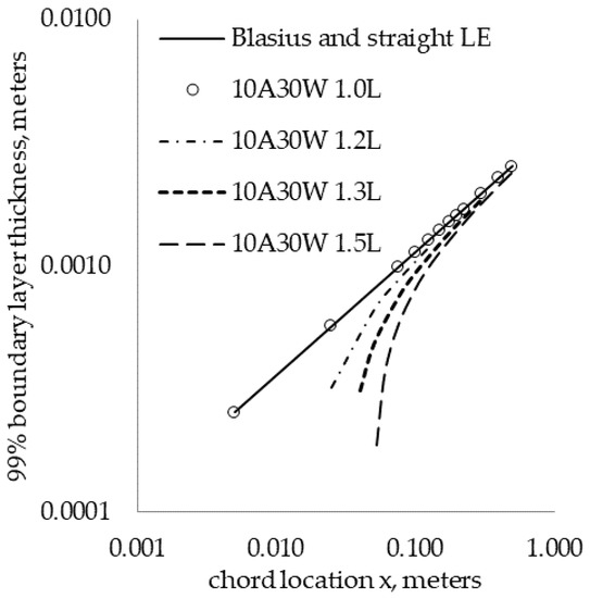 Next, the boundary layer profiles for the wavy LE were calculated at different chord and span locations for wavelengths of 30%, 15%, and 7.5% at a fixed 10% amplitude (10A30 W, 10A15 W, and 10A075 W). It was found that the boundary layer profile plotted in both dimensional and nondimensional units at a given span location was independent of wavelength. Figure 10 shows the boundary layer thickness across the chord for three different LE wavelengths at 1.2 L and 1.5 L span locations as an example of the independence of the boundary layer profile with the LE wavelength.