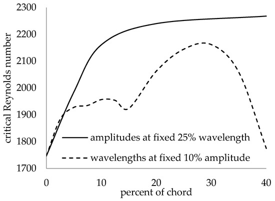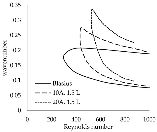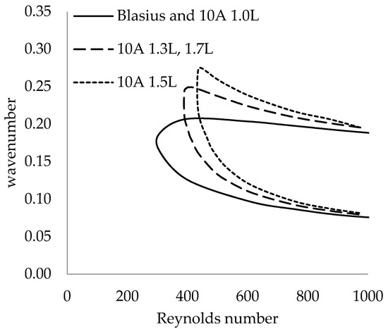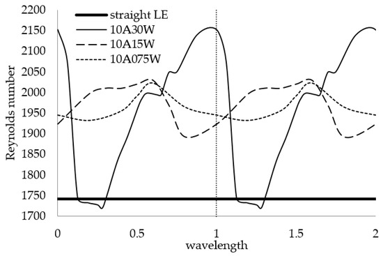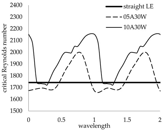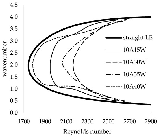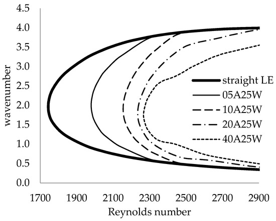The effect of the span location for a fixed 10% LE amplitude is shown in Figure 12. The neutral curves for the wavy LE peak and Blasius flow of the straight LE are equivalent, with a critical Reynolds number of approximately 302, which is in good agreement with Jordinson [22]. Both the critical Reynolds number and the range of unstable wavenumbers increase from the peak to the trough. The neutral curves are symmetric about the LE trough as expected from the symmetry of the base flows.