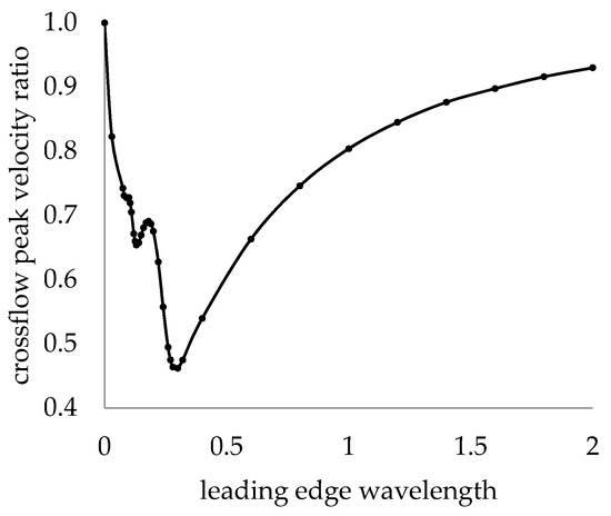 For a wavy LE, the flow profile will approach that of a straight LE plate when the LE wavelength approaches both zero and infinity. It is therefore expected that an optimum LE wavelength between zero and infinity may exist that maximizes the wavy LE modification of the base flow. To estimate the optimized LE wavelength, base flow calculations were performed over a range of LE wavelengths at a fixed LE wave amplitude of 10% chord and a fixed 10% chord location, and compared to the infinite span solution for a straight LE. Figure 15 plots the crossflow peak velocity ratio, defined as the peak crossflow velocity normal to the freestream resultant vector for a wavy LE divided by the same velocity for the straight LE. It is seen in Figure 15 that the velocity modification factor approaches unity for a zero wavelength and for large wavelengths, and that there exists a wavelength near 25% chord that minimizes the crossflow velocity.