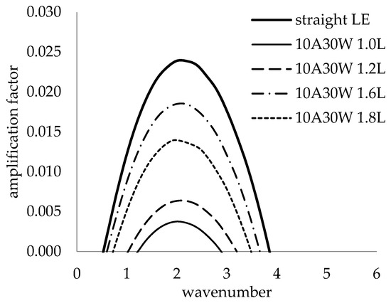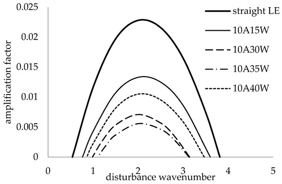 Plots of the temporal amplification factor for a Reynolds number of 2300 at a fixed 10% amplitude and for a range of wavelengths are shown in Figure 19. The most amplified wavenumber is nearly constant for all the LE geometries, showing that the LE waviness has little effect on the most amplified wavenumber.