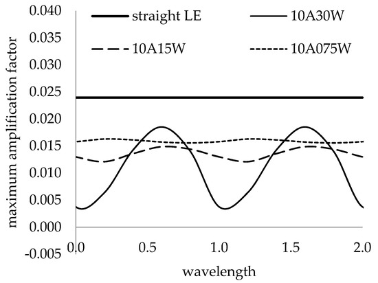 A global stability analysis was performed for different LE geometries by calculating the critical Reynolds numbers and maximum amplification factors at span locations between successive LE peaks. The effect of the LE wavelength is presented first. Figure 20 shows the critical Reynolds numbers for wavy LE geometries at a fixed 10% amplitude and 30%, 15%, and 7.5% wavelengths (10A30W, 10A15W, and 10A075W, respectively). The critical Reynolds numbers are plotted against a nondimensionalized LE wavelength, with integer values of the nondimensionalized wavelength corresponding to the LE wave peak, and values of 0.5 and 1.5 corresponding to the wave trough. The 10A30W geometry exhibits strong oscillations across the span, with a peak critical Reynolds number near 1.0 (the dotted vertical line shows where the local analysis was carried out, Figure 17) and 2.0 and a low critical Reynolds number at or slightly below the straight leading-edge case near 0.25 and 1.25. The effect of sweep is characterized by the steep decline in the critical Reynolds number past the peak near the wavelength of 1.0 and a slow gradual rise past the wavelength of 1.25. By contrast, for the 10A15W and 10A075W geometries, the critical Reynolds number had less pronounced oscillations across the span, with both cases having similar critical Reynolds number when averaged over the LE wavelength. Additionally, it is worth noting that the maximum critical Reynolds number for both cases—10A15W and 10A075W—occurred near the trough: wavelengths 0.5 and 1.5. On average, the critical Reynolds numbers for all three cases were higher than the straight leading-edge case.