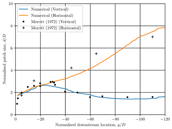 In general, the numerical model was able to capture the key stages of mixed patch evolution and yielded a qualitative agreement with the experimental observations. In order to provide a quantitative assessment of the model’s validity, the dimensions of the mixed patch were compared with data from the analogous experiment by Merritt [
