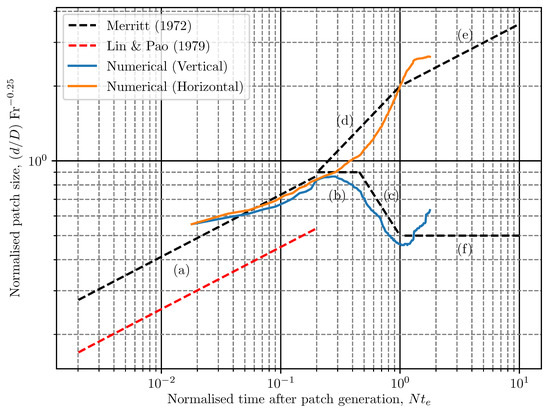 Between and = 0.2 the expanding mixed patch in a stratification is expected to grow at a rate proportional to (scaling laws in region (a)); the same rate observed for a non-stratified environment. The numerical results between = 0.08–0.2 successfully exhibit this rate of expansion. The slower rate observed immediately downstream of the propeller (between = 0 to 0.08) may be attributed to a lower rate of turbulent mixing by the propeller blades compared to the oscillating grid apparatus used in the experiments.