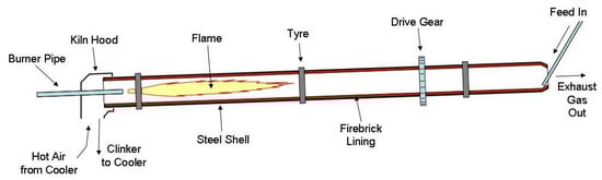 We target a direct-fired counter-current flow rotary kiln in which the temperature reaches levels above 1800 degrees Kelvin. The kiln is placed horizontally with a slight inclination, as shown schematically in