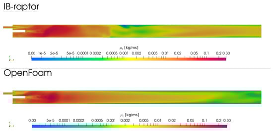 Figure 4, respectively. Both codes capture large values with comparable magnitude near the burner and decreasing values towards the outlet. For rhoSimpleFoam, this decrease is monotonic, whereas it is not for IB-Raptor. More interestingly, both codes predict an eddy viscosity that remains large for a large distance downstream from the burner. This compares favorably with results in [