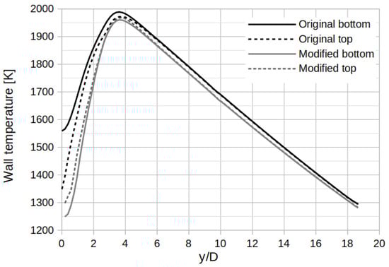 Figure 8 shows the temperature on the interface between the freeboard gasses and the refractory lining. The solid and dashed dark lines correspond to the bottom and top wall in the rectangular configuration, respectively. The grey lines correspond to the annular inlet. All four graphs show a peak near the end of the flame and a linear decrease beyond the peak value. In the case of the rectangular inlet, the peak values of the bottom and top wall differ more than in case of the annular inlet. The peak values in the case of the annular inlet are lower than in the case of the rectangular inlet. At the top, the annular inlet yields the same peak temperature as the rectangular air inlet. Further downstream, the temperature of the annular inlet is slightly lower. These results can be explained by the fact that in the case of the annular inlet, the flame temperature is lower and the heat is mainly transported via radiation. The results for the rectangular air inlet are in good agreement with Figure 7 in [