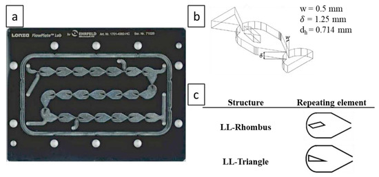 Geometry of FlowPlateTM and mixing elements: (a) LL (liquid-liquid)-Reactor (triangle) size A7 plate arrangement [17] (licensed under https://creativecommons.org/licenses/by/4.0/); (b) three-dimensional visualization and characteristic dimensions of the (rhombus) mixing element; and (c) repeating mixing elements in the LL-Rhombus and LL-Triangle [17] (licensed under https://creativecommons.org/licenses/by/4.0/).