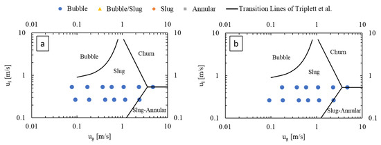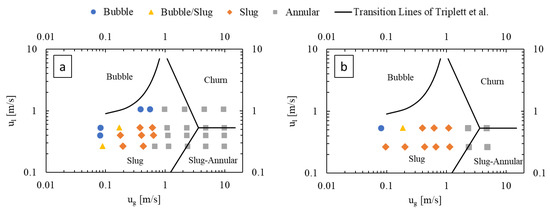 Flow regime maps of (a) LL-Rhombus and (b) LL-Triangle, with 0.5 wt% aqueous ethanol solution as the liquid phase.
