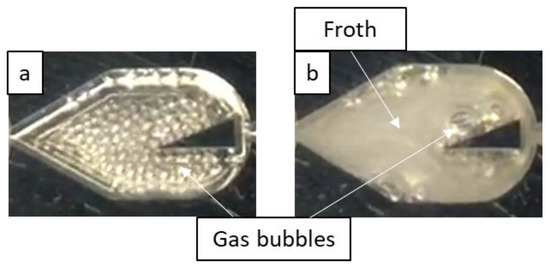 Flow in the LL-Triangle mixer demonstrating the effect of an increased gas flow rate on the flow morphology where surfactant is present. Gas velocities are (a) 0.091 m/s and (b) 0.65 m/s, and the liquid velocity is 0.27 m/s. Note that (a) demonstrates bubble flow, and (b) demonstrates bubble flow with froth formation.