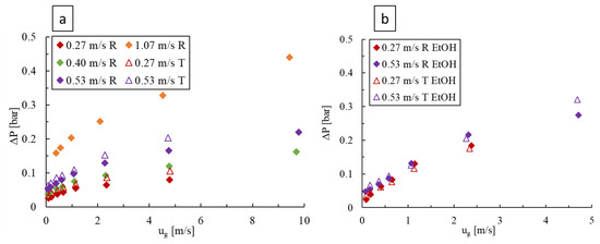 Pressure drop over varying liquid and gas velocities in the LL-Rhombus (R) and LL-Triangle (T) reactors with (a) water and (b) 0.5 wt% aqueous ethanol as the liquid phase.
