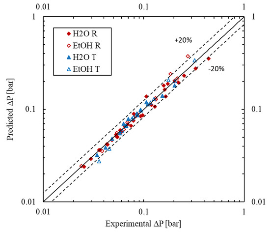 The data from both the water and aqueous ethanol solution were fitted to the two-phase flow model of Lockhart–Martinelli [23], which adds a two-phase friction multiplier, , to the pressure drop gradient of a single phase, as seen in Equation (2). The two-phase friction multiplier is a function of the Martinelli parameter, , and of the Chisholm parameter, (Equations (3) and (4)). Since liquid is the wetting phase of the reactor and has the greater pressure-drop gradient, this phase and its associated friction multiplier were chosen for the model.