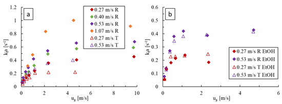 Figure 10b, when ethanol is present, shows a similar impact of liquid and gas velocities, where the values eventually reach a plateau at the greater gas velocities for a given liquid velocity. As with the pressure drop data, the impact of obstacle geometry is again marginal. For given fluid velocities and geometry, values were generally higher with ethanol present due to the greater resulting specific interfacial area. Here, the plateau in occurred when the flow resembled a froth where the chaotic eddies in the liquid phase were likely dampened or too small, such that their effective contribution towards surface renewal and interfacial breakdown is decreased [13,25].