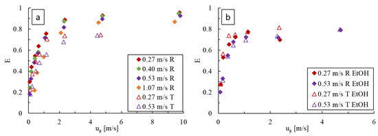 Comparison of the extraction efficiency, , at varying gas and liquid flow rates in the LL-Rhombus (R) and LL-Triangle (T) with (a) water and (b) 0.5 wt% aqueous ethanol as the liquid phase.