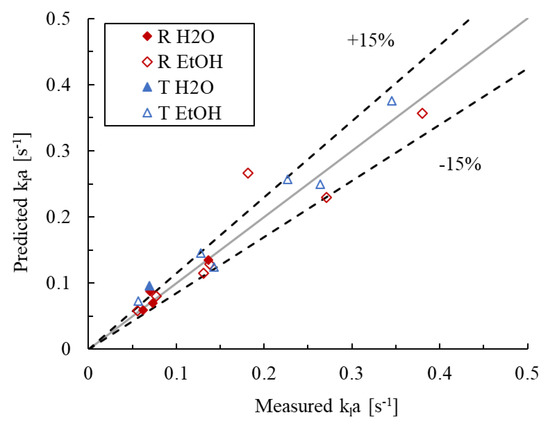 The parameters of the model described by Equation (12) were fitted to the bubble flow regime data, where the had not yet plateaued. Considering the confidence intervals for the model parameters, the data of all four combinations of liquid phases and reactor geometries were ultimately pooled, suggesting that the obstacle shape and presence of ethanol have statistically marginal effects on the values of for a given flow superficial velocity ratio and power dissipation. The resulting parameter values are given in Table 3, along with the upper and lower 95% confidence intervals. The associated parity plot is presented in Figure 12, where the AARE is 13.9% and the bias factor is 1.05. Furthermore, the value of is 0.55, close to the expected value of 0.65 discussed earlier, indicating that the power dissipation model approach is appropriate.