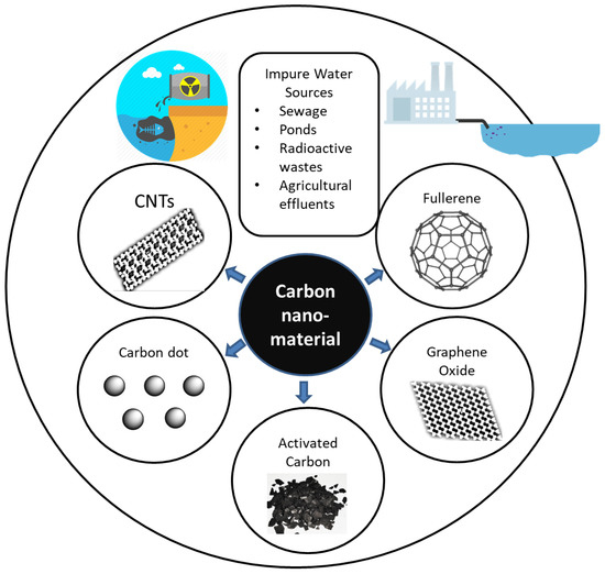 Conventional water treatment includes absorption, membrane filtering, and distillation processes [2,3,4]. Industrial effluent, agricultural waste water, sewage, and radioactive waste water are sources of contamination, as shown in Figure 1. Carbon nanoparticles can potentially be used for technological innovation in terms of improving water treatment due to being eco-friendly and cost-effective [5] and because of their specific surface area, strong sorption, fast kinetics [1], thermal stability, and conductivity [2,6,7]. Single-walled and multiwalled carbon nanotubes (CNTs, MWCNTs), graphene, and fullerene are among the most popular examples of carbon nanoparticles [1]. Graphene has been one of the most widely tested materials for water purification technology since its discovery in 2010 [4].