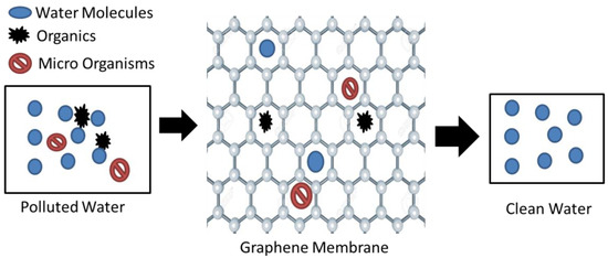 Graphene oxide (GO) and reduced graphene oxide (rGO) are the two main derivatives of graphene [25]. Graphene oxide (GO) acts as a promising sorbent, having the ability to efficiently remove heavy metals and radionuclides. GO has attracted attention within the research community due to its extremely powerful separation ability. The presence of -OH, -COOH, -C=O, and other hydrophilic groups is the possible reason for this [26,27]. The highly functionalized operative surfaces of GO give it the potential to remove pollutants from water, as displayed in Figure 2 [28]. It can be observed that the graphene structure is only permeable to water molecules, and hence filters out impurities.