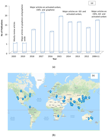 Figure 4a,b shows the chronological distribution of the recent publications and the geographical locations of the contributing authors for articles relating to water purification involving carbon-based nanoparticles. It can be observed that activated carbon, CNTs, and graphene are the most used carbon materials. This reflects the increase in attention from the research community towards testing carbon-based nanoparticles in water purification systems. Additionally, it can be observed that the researchers in this field are spread globally.