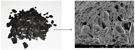 Activated carbon is formed from carbonaceous materials (bamboo, eucalyptus, lignite, coconut shell and husk), which makes it cost-effective, and hence widely used in water purification technology [19,28]. Figure 5 shows the granular activated carbon with its corresponding FESEM image. It can be observed that macropores are visible on its surface. In general, activated carbon is a crude form of graphite with a highly porous structure, containing pores of various sizes. It has a large number of cracks and crevices at the molecular level, which greatly increase its surface area. Activated carbon has an internal surface area of up to 1500 m2/g. This enables activated carbon to carry out a phenomenon called adsorption, in which the molecules of a liquid or a gas are trapped by the internal or external surface of a solid. The structure of activated carbon is almost similar to that of pure graphite, since the C-C bonds hold the hexagonal layers in the activated carbon molecules. The graphite crystals are composed of layers of fused hexagons held by weak van der Waals forces. The pore structure develops in the activated carbon, and thus the final properties of the activated carbon mainly depend on the raw materials and the production process [38].