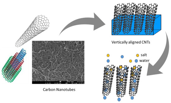 A carbon nanotube can be considered as a graphene sheet that has been rolled up to make a seamless cylinder with a diameter as small as 0.4 nm, with a length of up to a few centimeters, and half of a fullerene molecule in each end as a cap. CNTs come in various forms, such as single-walled carbon nanotubes (SWCNTs), double-walled carbon nanotubes (DWCNTs), and multiwalled carbon nanotubes (MWCNTs). SWCNTs consist of a single sheet of graphene forming a cylinder, as shown in Figure 6. The small diameter of CNTs means they are impermeable to impurities and makes them able to purify water. DWCNTs consist of two such cylinders in a concentric arrangement, whereas MWCNTs consist of an array of concentric cylinders that are positioned at a distance of 0.35 nm from each other. There are various ways to define the structure of carbon nanotubes. One possibility is to consider that CNTs may be obtained by rolling a graphene sheet in a specific direction, maintaining the circumference of the cross-section [39]. Since the microscopic structure of the CNTs is closely related to graphene, the tubes are usually labelled in terms of graphene lattice vectors. Two types of carbon nanotube (CNT) membranes can be fabricated, namely (i) vertically aligned (VA) and (ii) mixed matrix (MM) CNT membranes [40].