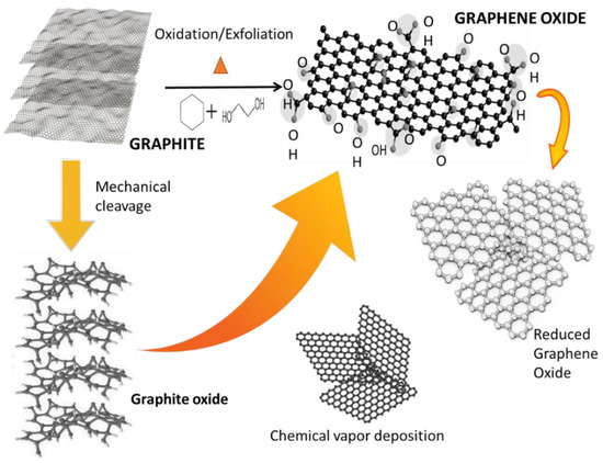 Graphene oxide (GO) can be regarded as a typical two-dimensional oxygenated planar molecular material, with sp2 carbon atoms in a honeycomb structure [30]. GO is a non-stoichiometric chemical compound comprising carbon, oxygen, and hydrogen in a variable ratio, which largely depends on the processing methodologies [30]. It possesses abundant oxygen functional groups that are introduced into the flat carbon grid during chemical exfoliation, which present as oxygen epoxide groups (bridging oxygen atoms), carbonyl (C=O), hydroxyl (-OH), phenol, and even organo sulfate groups. Figure 8 shows theoretical models of the structure of graphite or graphene oxide [31]. In 1936, Hofmann and Rudolf [44] proposed the first GO structure, in which numerous epoxy groups were randomly distributed on a graphite layer. In 1946, Ruess [45] updated the Hofmann model by incorporation hydroxyl entities and alternating the basal plane structure (sp2 hybridized mode) with an sp3 hybridized carbon system (where s & p are atomic orbitals).