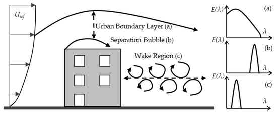 For example, the lack of a reliable prediction of the turbulent flow environment is recognized as the main limitation for the urban wind energy to progress into a practicable way of harnessing energy at its consumption place [10,11,12,13]. Pedestrian level winds have also been confirmed as having a strong correlation with the turbulent environment for the evaluation of distress and comfort [14,15]. The installation of roof-mounted structures (solar panels [16], etc.) has been characterized as providing a possible benefits regarding a better prediction of the flow environment to reduce the burden and cost of the roof due to ballast and anchoring. Debris due to wind storms are starting to be investigated and findings point to the conclusion that turbulence is essential to predicting risk to the public [17,18,19]. Pollution dispersion [20,21,22], wind turbine wake [23,24,25,26], and aero-acoustic applications for human comfort [27] are also among the applications where predictions of turbulence play crucial roles.
