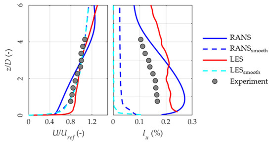 Figure 5 shows the inflow statistics as computed by both smooth and turbulent RANS and LES cases, measured at x = 7D upstream of the model, corresponding to the limits of the turntable of the wind tunnel tests at a distance of x = 0.9 m from the center. The turbulent cases (referred to as RANS and LES) generate the mean wind speed and the turbulence intensity by replicating the wind tunnel geometry, while the smooth cases (RANSsmooth and LESsmooth) have the experimental inflow imposed at the inlet.