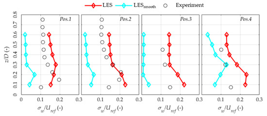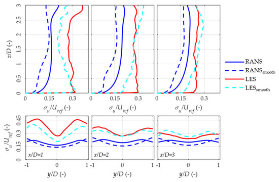Figure 8 shows the mean longitudinal wind velocity U, for which the performances of RANS and LES are comparable. For the fluctuating inflow cases, at lower heights z/D < 0.1, RANS seems to provide a closer match to experimental results compared to LES computations. However, RANS did not detect a separation at position 3. Positions near walls are usually difficult to assess in wind tunnel tests using physical probes (in the present study, hot-wire anemometers). Even if the probe is correctly placed, normally only a limited sensitiveness is available, which might affect the accuracy. Therefore, the lower experimental results are to be taken critical. For instance, a separation seems not to occur at position 2 or position 1, where clearly all numerical techniques indicate there is one. RANS and LES report similar extents of the separation bubble at position 1 and position 2, but cone vortices seem not to be modelled consistently at position 3 and position 4 [35]. As for the smooth inflow, RANSsmooth and LESsmooth provide analogous results throughout the dataset. In general, the extent of the separation bubble seems to be overestimated by both techniques at around 50% larger. This shows how turbulence in the inflow contracts the separation bubble, hence delaying separation and reattachment, which arguably is crucial in the prediction of the flow in the roof region. Figure 8 also shows LES statistics calculated using both the ensemble average (i.e., the average is taken over the entire signal, analogously to RANS theoretical formulation) and the time average (indicated with LESprobes, where the average is done over statistics taken for several signal segments of 1 s duration). Results are consistent, hence reassuring us of the stationarity of the signal, and therefore the comparability of RANS and LES and on the sufficient length of the sample time for LES, in this case T ≈ 6 s for both inflows.