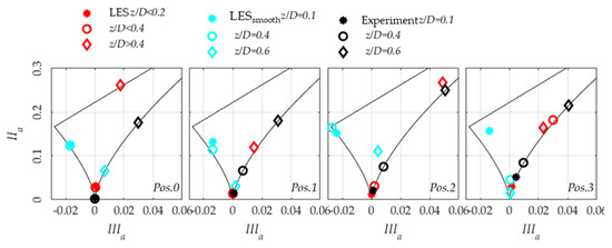 While a discussion on the anisotropy of turbulence might be done using longitudinal and transversal turbulence intensities, there are other methods that use all flow components and yield more accurate interpretations. Figure 11 shows the second and third velocity invariants, and , for the measured positions, calculated as explained in [37,55]. Close to the wall, the flow is highly isotropic at all positions, and the anisotropy tends to increase with height for position 1 and position 4, and the flow is rather isotropic also at z/D = 0.1 for position 1. This is consistent with findings in the literature, where it has been found that the anisotropic turbulent inflow stretches around an obstacle, hence increasing its isotropy [51,56]. At position 2, as the separation bubble thickens, the flow is already anisotropic for z/D > 0.2. LES seems to overpredict anisotropy, and this is in line with previous findings on the turbulence intensity [54]. The overprediction is accentuated at position 3 and position 4, which represent the cone vortex behavior [35]. In smooth flow conditions, LESsmooth yields unphysical results, with a high isotropy shown in the freestream and a subsequent anisotropy due to the stretching around the building, with high anisotropy near the wall.